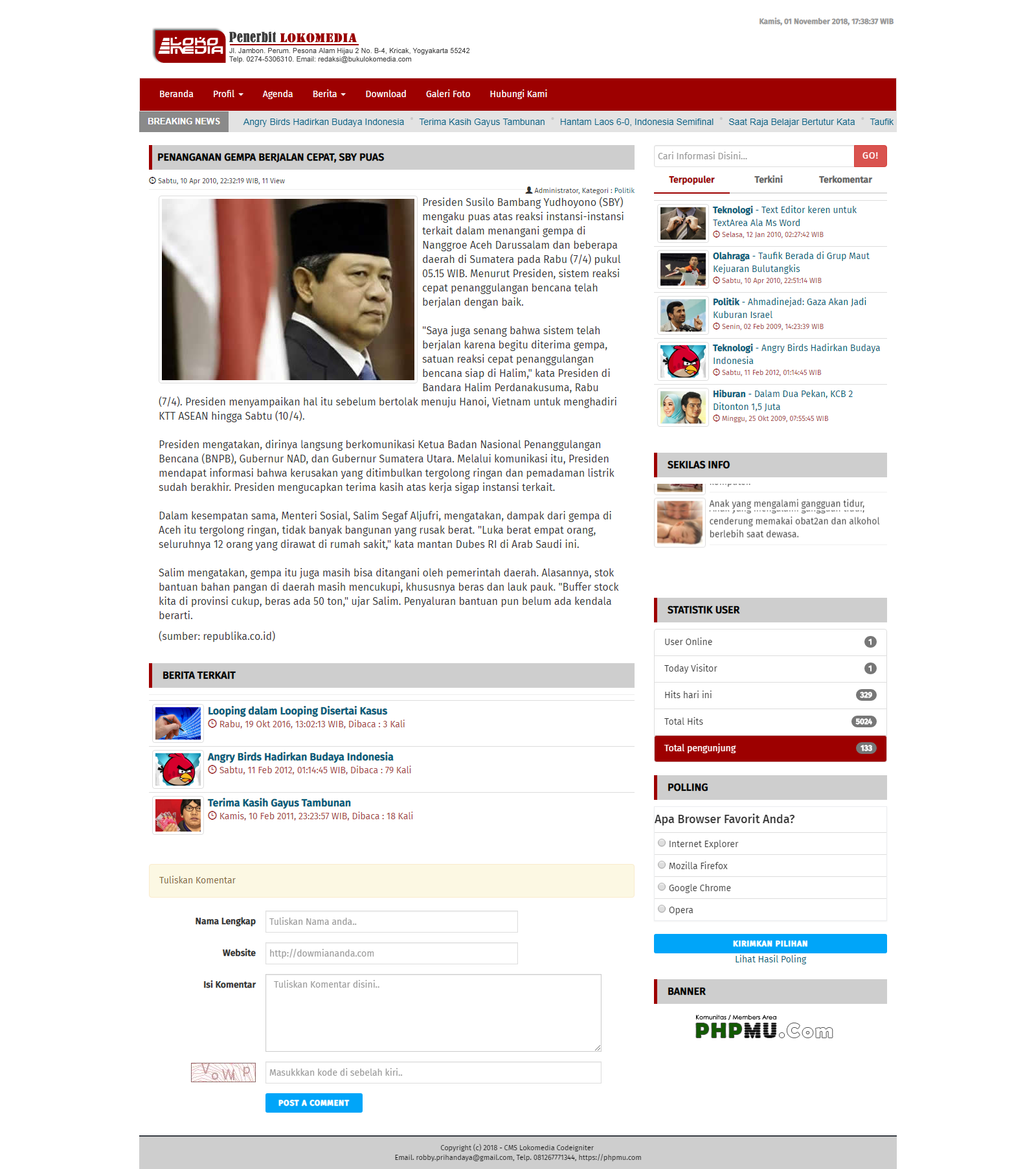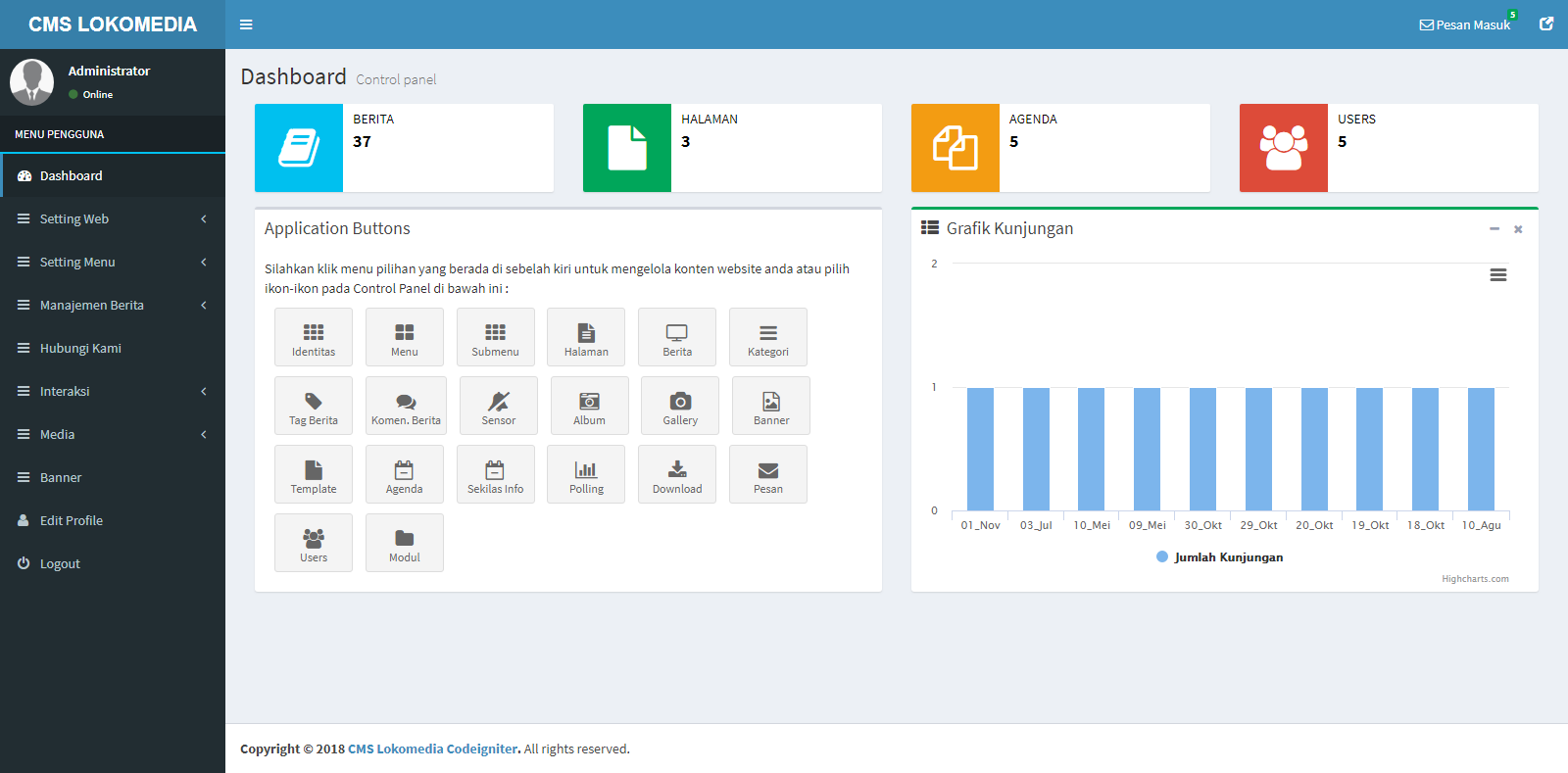 CMS LOKOMEDIA adalah salah satu CMS (Content Management System ) buatan anak negeri yang tak kalah menarik dibandingkan CMS yang lainnya. sobat dapat menggunakan-nya untuk web Intansi, sekolah maupun web pribadi, karena CMS ini cocok digunakan untuk berbagai macam keperluan yang sudah menyediakan beberapa modul yang siap pakai.